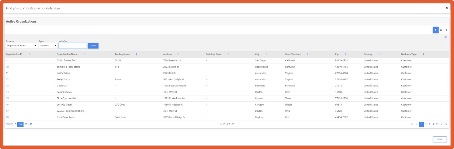 5。会社が見つからない場合は、[X] をクリックしてフィルターウィンドウを閉じます。
